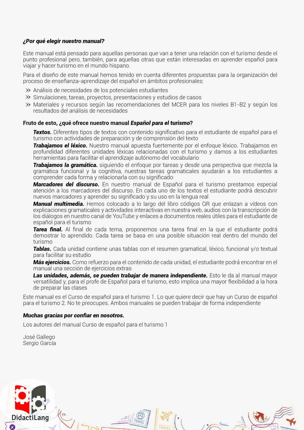 - Este manual es el Curso de español para el turismo 1. Lo que quiere decir que hay un Curso de español para el turismo 2. No te preocupes. Ambos manuales se pueden trabajar de forma independiente